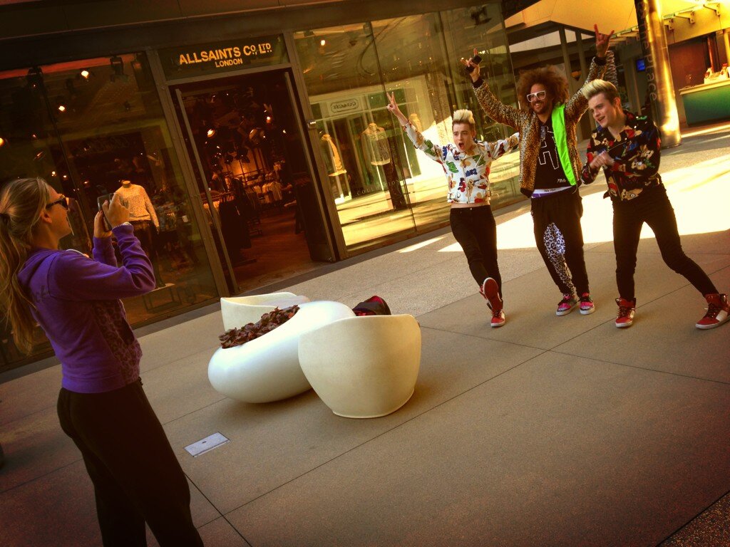 Jedward seen here in Santa Monica, are recording new material and as you can see they are spending time with LMFAO front man RedFoo. Is this an indication of where their music is heading? It is interesting to see that despite not winning Eurovision, they have certainly made the most of the experience and it has opened many new avenues for them.