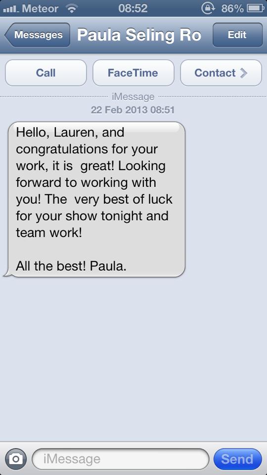 Lauren White (one of the composers of “Fire”) received the below text from Paula this morning supporting her and Zoe in the Eurosong Final.
