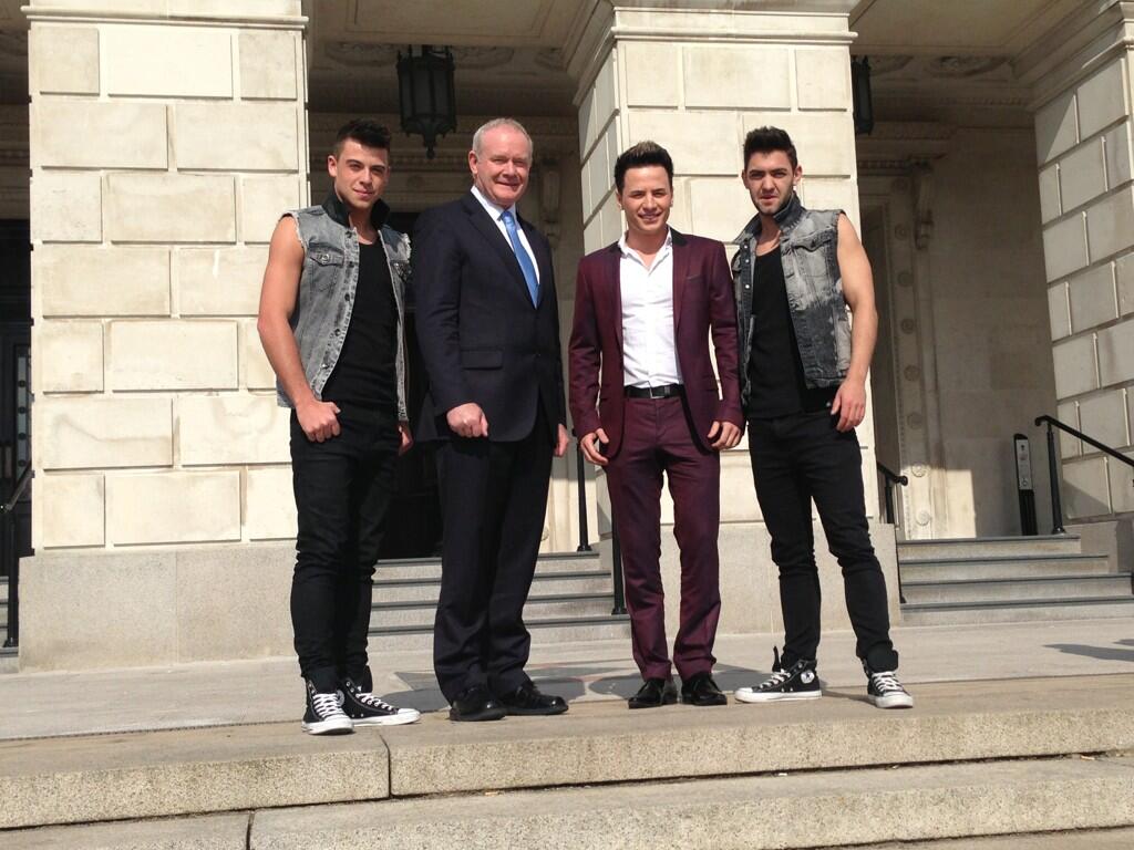 It is “Ryan Time” as we call it on Eurovision Ireland. Ryan Dolan (Ireland’s representative at Eurovision 2013) has had a busy few days. On Monday he performed at Stormont (The Northern Ireland Parliament Buildings) for the The DUP First Minister and performed for the parliament members. Not many performers are awarded this honor and Ryan was there with his 2 backing singers. Here he is pictured below with Martin McGuinness at the steps of Stormont.