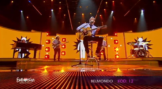 Penultimate song of the night is ‘This is my life’ by Muzikfabrik. They are a five-piece band. This is more in the mode of an uptempo Compact Disco song. There’s a good stage presence here and their extra member – a female backing singer – plays a large part in the song. It could also be a good floorfiller at a Euroclub. The jury gives Muzikfabrik 34 points.