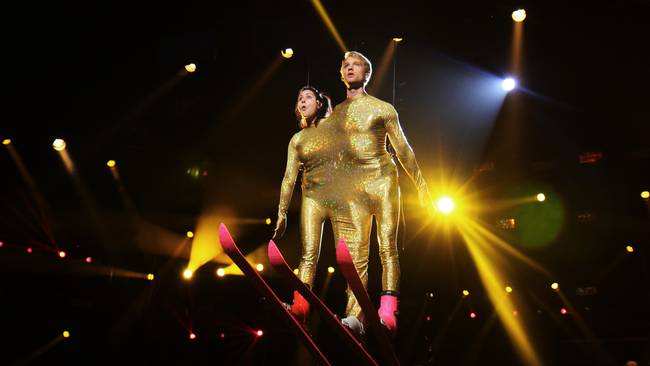 We are presented with Sochi The Musical. All the dancers are dressed in gold leotards.