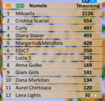 These votes get transferred to 12, 10, 8 etc. So Mikaella is in the lead. Aurel Chircoata and Lana Lights are still on zero points.