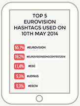 There were 2 official Eurovision Hashtags used in this year’s contest. First up was #Eurovision and then Danish TV (DR) created the theme of their production #JoinUs. So how did they compare in the Top 5 most used Hashtags used during the Eurovision 2014 Grand Final.