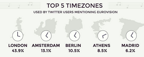 Well it seems that people in the London GMT time zone were the most active on Twitter during the Eurovision Grand Final. A staggering 5,384,678 tweets were posted about the contest during Eurovision. This means that 47,136 tweets were tweeted per minute during the live Grand Final. 44% of all tweets came from countries in the London Time Zone. So the Uk and Ireland were the most prolific users of Twitter on the night. But who was next?