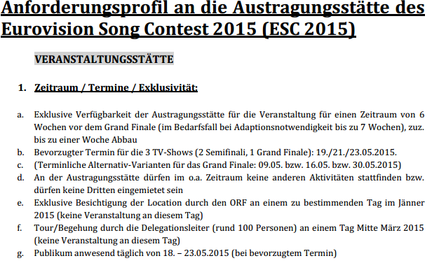 We looked at the official ORF website and saw their Eurovision Pages with the requirements for the Venue for 2015 – See Here