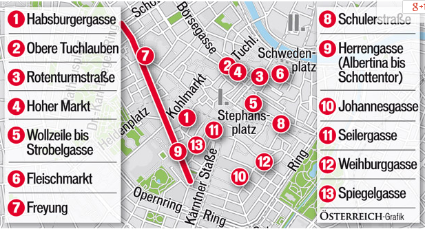 Plans and construction have already begun to pedestrianize the centre of Vienna. There are 13 zones in the city centre and the plan is to pedestrianize the full area. The first location already nearing completion is that of ‘Habsburgerasse’ (zone 1 on the above map) and this will be a pilot scheme. Should the project be a success then the other 12 zones are to be completed. This initiative is being led by City-leader of the Green Party Alexander Hirschenhauser saying “This brings consideration and traffic safety.”