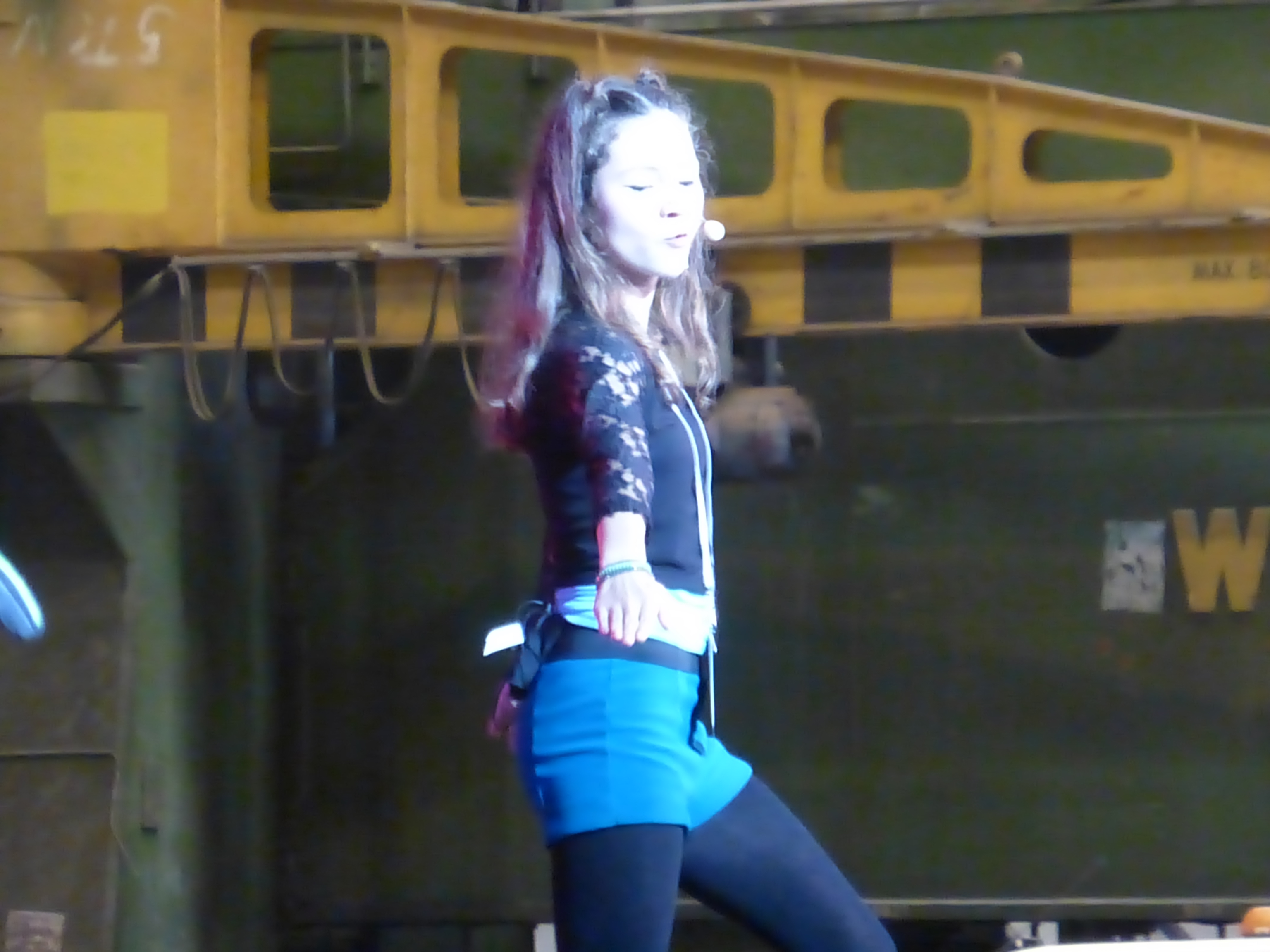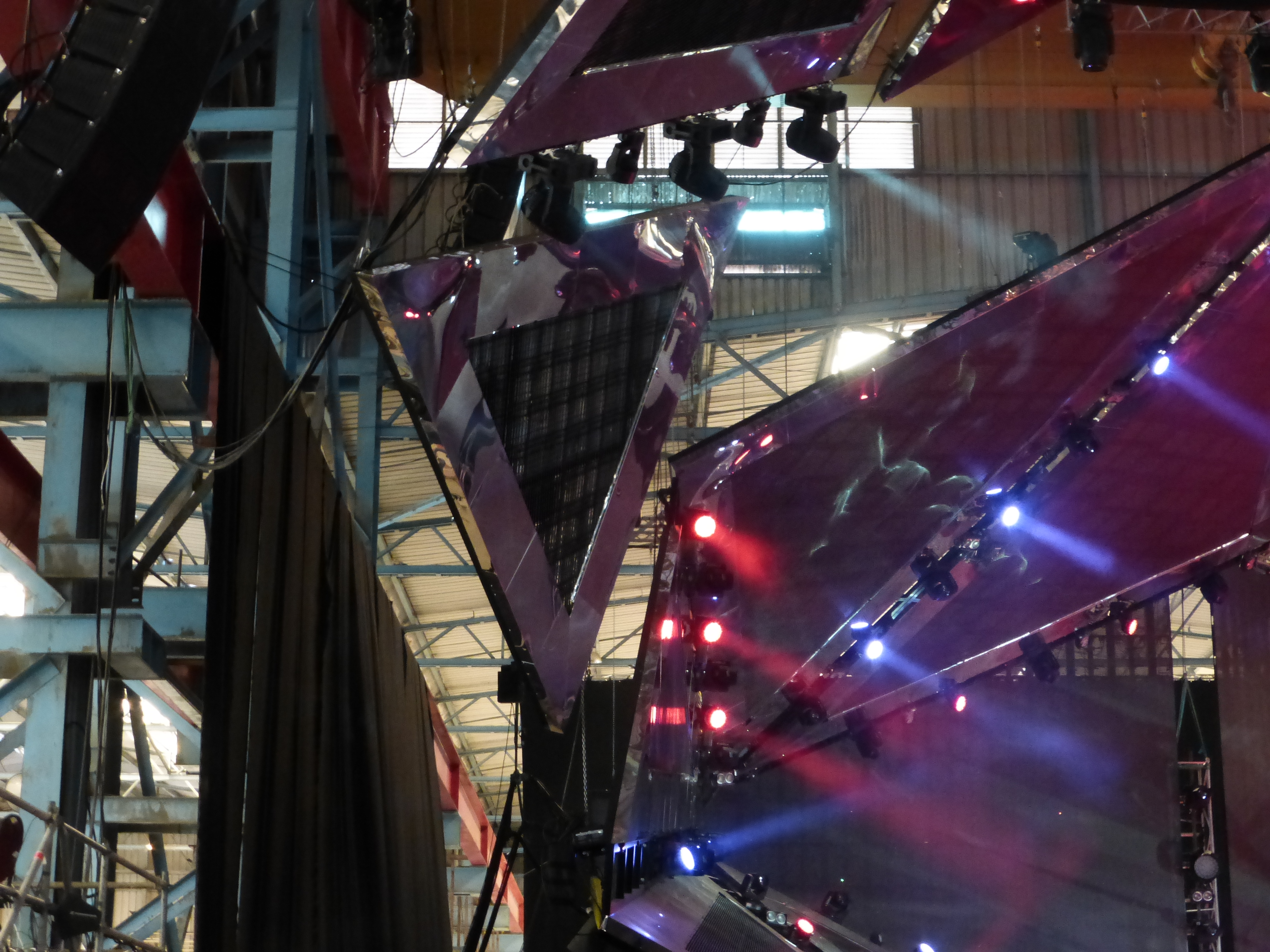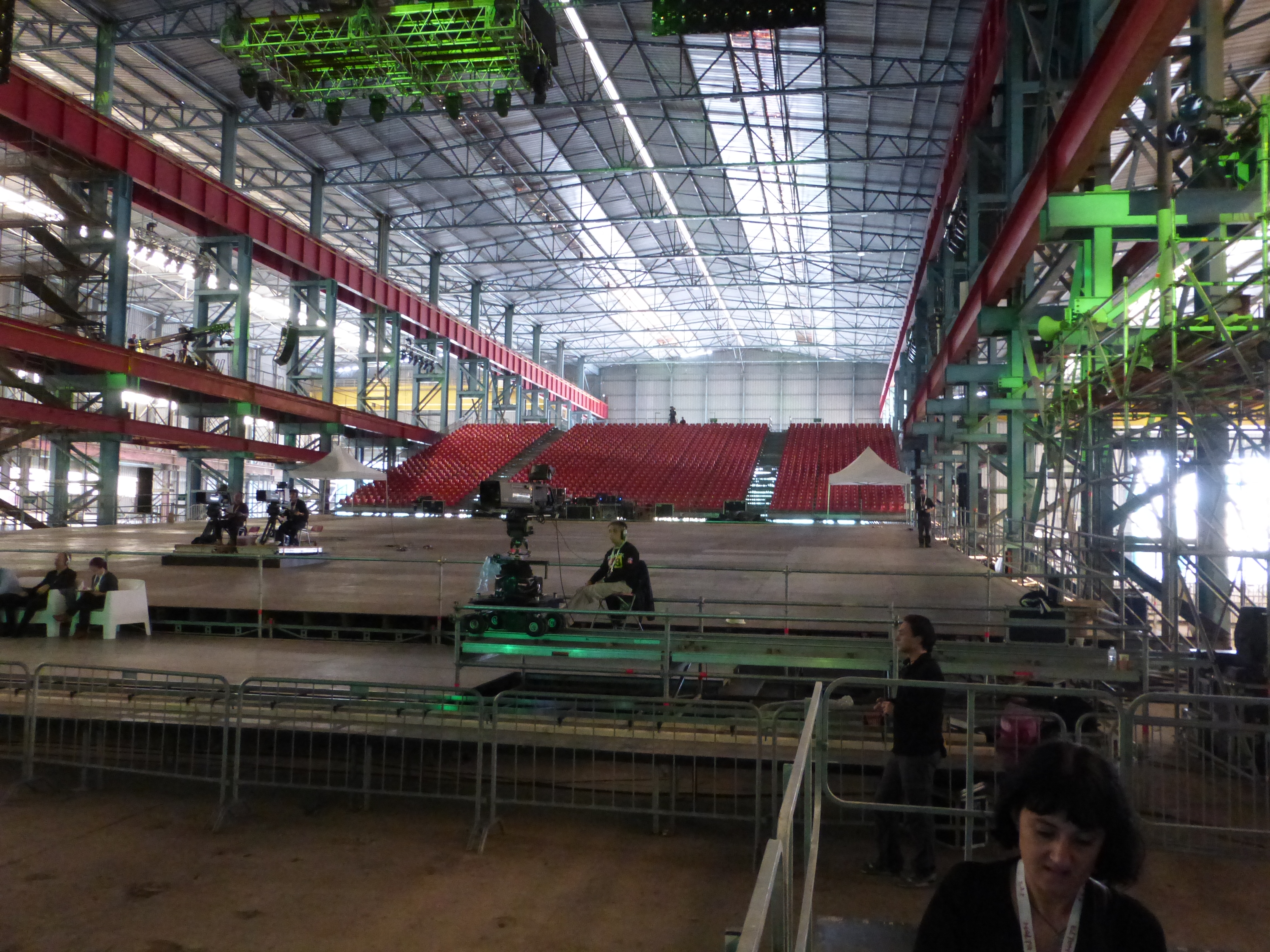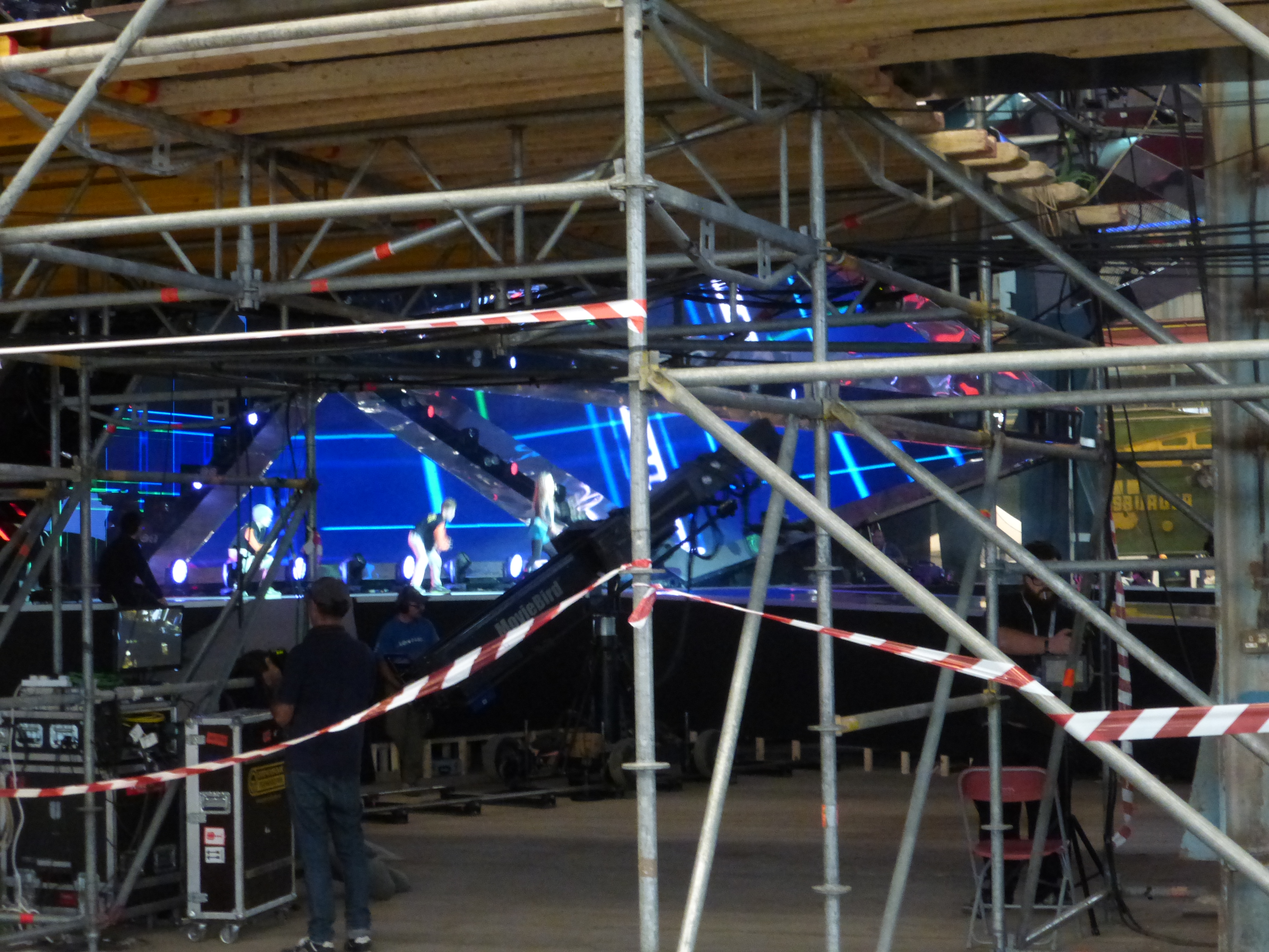 Some views on the fringes of the arena inside the shipbuilding shed. One shows the stage through scaffolding and the other looks over the stage to old signage in the background.