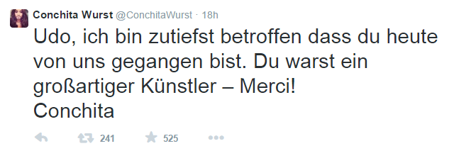 This year’s Eurovision Winner Conchita Wurst expressed her deep sense of loss at the passing of Udo Jürgens. The team here at Eurovision Ireland express our condolences to the family of Mr Jürgens and say ‘Merci’ for the wonderful Eurovision memories.
