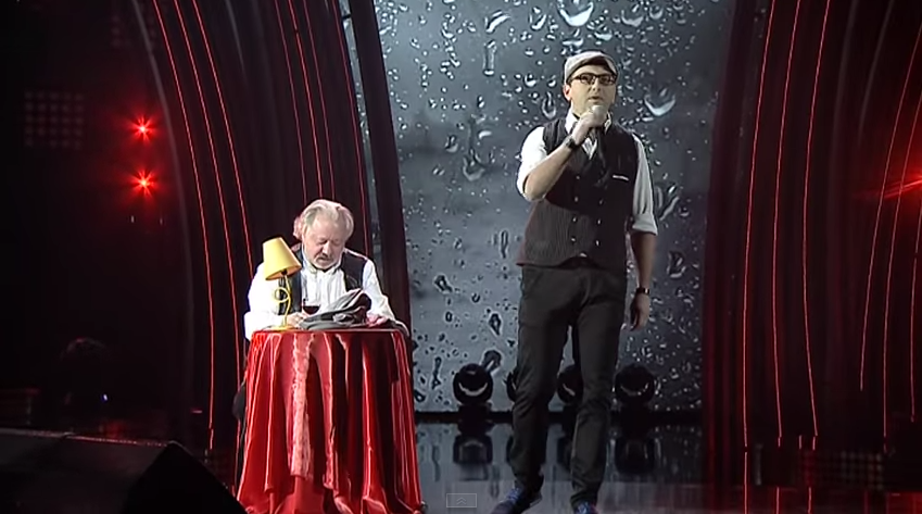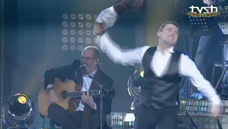 This is what happens when Alexander Rybak cancels on you. You get the presenter and a singer winging it and stripping on stage. Come back Alexander!!!