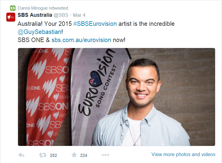 Thanks Eurovision Ireland – we are pretty proud of Guy Sebastan here in Australia – nice to see fellow artists like the fabulous Kylie and Danni Minogue getting behind him as well.