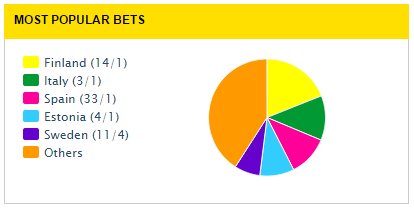 A few interesting points are the Italy has been drifting from the favourite for over a week now while those on Sweden have been shortening.