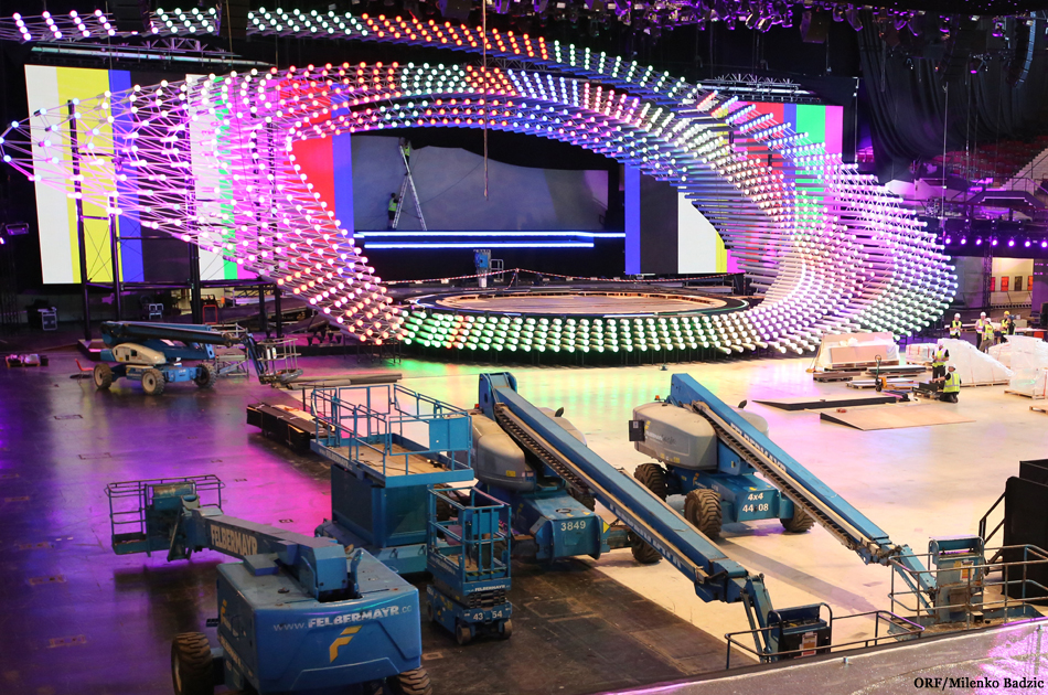 The stage is now complete at the Wiener Stadthalle as the stage is now fully completed. Now the lighting and screens can be tested and made ready for the first rehearsals on Monday May 11th – See the Rehearsal Schedule HERE
