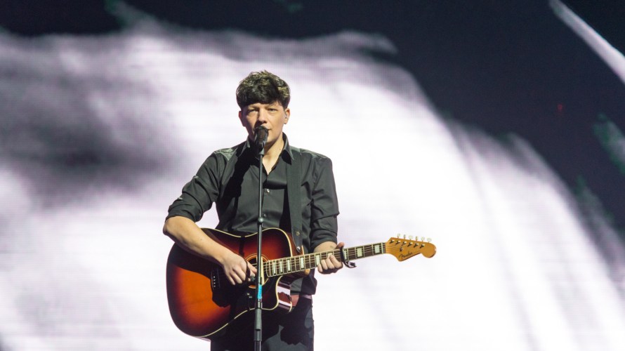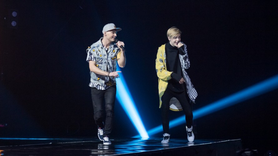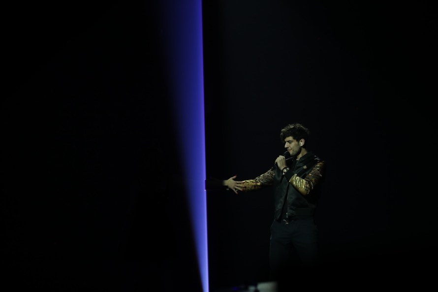 Vaje up next with a song that has a slight country feel to it. It is a good pop song that is highly fancied. He stands on stage with a laser light bathing the stage behind him. Dancers hands come forth from the beam. Nice effect. Vaje is singing his song very confidently and giving his all. This does have a fair chance of progressing too tonight.