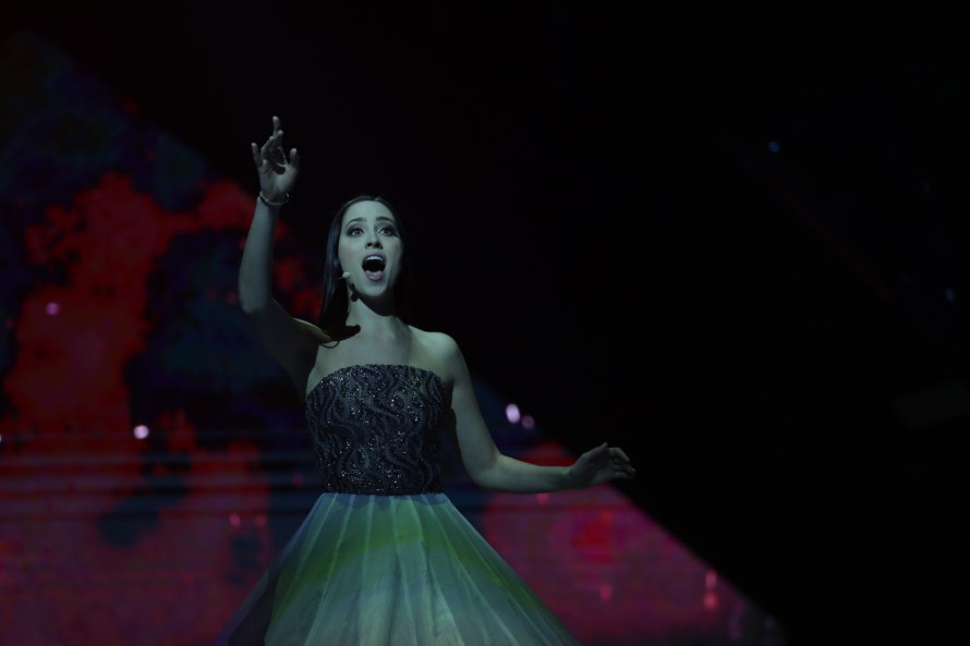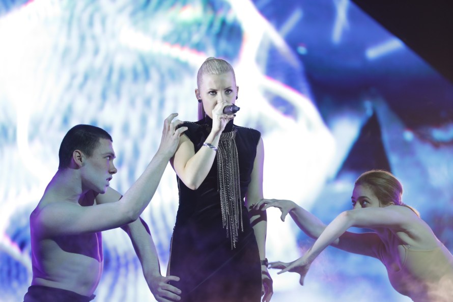 Nika starts on a platform with dry ice swirling around. She sits centre stage with her legs astride. She is accompanied by very athletic male dancers. The song is very surreal really. The performance is enhanced by the backdrop and dancers. Her vocal is quite extreme and unusual but it works for the style of the song. Not bad but not a winner.