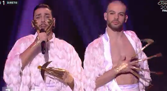 Conan got big cheers even as his name was announced. Performance art or what? Conan has a metal mask that looks like spoons. And he’s in a long white furry coat. It’s not your typically structured song, but you can’t look away. It amazes at every turn and has to be in with a chance tonight. Another massive standing ovation. Go on, Portugal, I dare you.