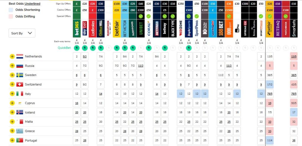 So now it’s time to have a look at all 41 countries odds and how these have changed (or not!) since we last looked. Does your personal scoreboard look like this?