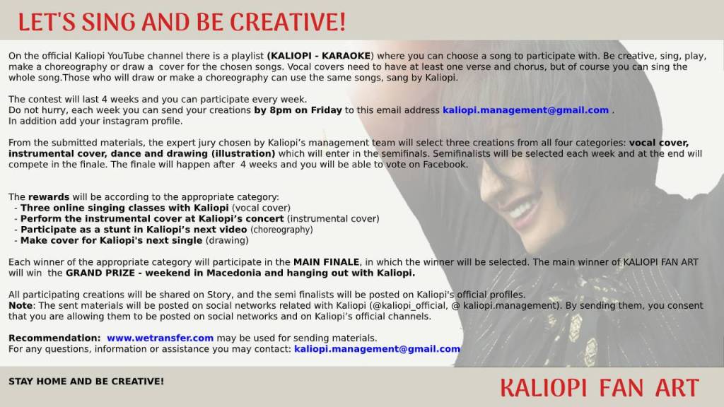 “In the past few weeks, I have introduced people virtually into into my home to share my colorful world of music and emotions. I wanted for just a moment to get away from the day-to-day events that are surrounding us at this moment and of course overcome the fear and mistrust with a song. And then I realized how many possibilities and creativity are hidden in each of you. So that’s why I decided, with the help of my team, to create a place where each of you will realize your creative moments and will be closer while being apart from each other, by the motto #stayhome. Can’t wait for your reactions! WELCOME TO – KALIOPI FAN ART, I love you…… Kaliopi”