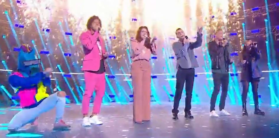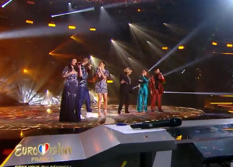 Now on stage we see the finalists singing along to Eurovision stars from France.