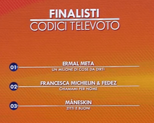 Out of this 3, I think I would prefer in this order: Francesca Michielin & Fedez, Maneskin and Ermal Meta.