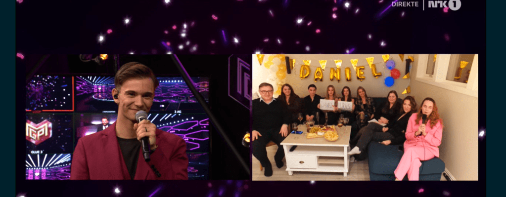 Here come the presenters, sadly only Kare and Mikkel tonight as Annika has tested positive for Covid-19, so has to self-isolate . They have however still included her as part of proceedings by showing her video calling . They are just showing the draw for the duels that was done earlier in the week.