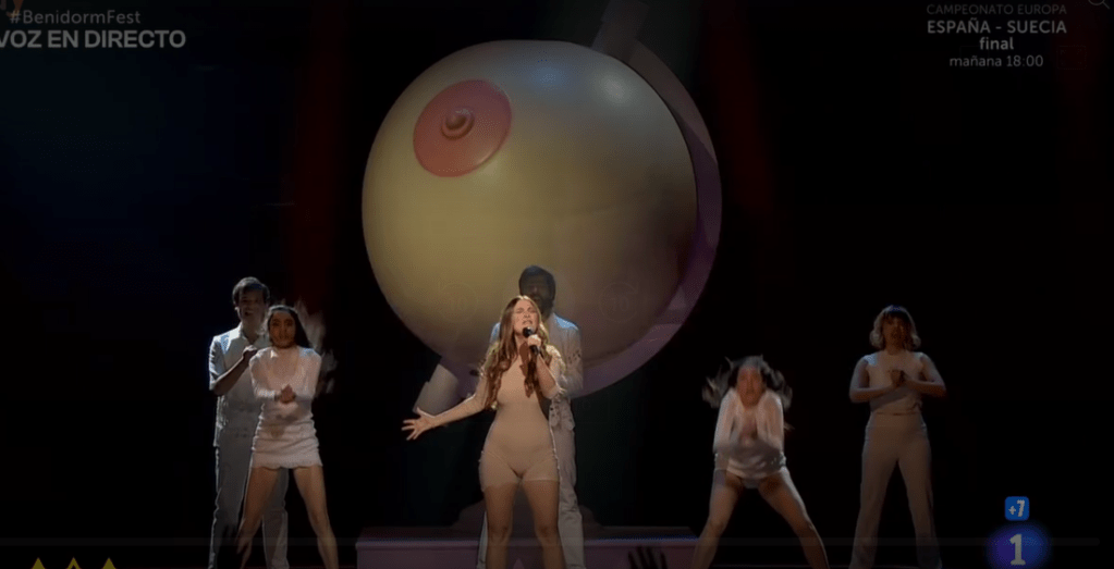 I’d been told about this, otherwise I’d have been somewhat alarmed… do not adjust your sets, that is a giant boob on the Benidorm Fest stage! Is Eurovision ready for this? Wonder if it’ll return tonight!!