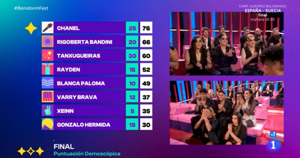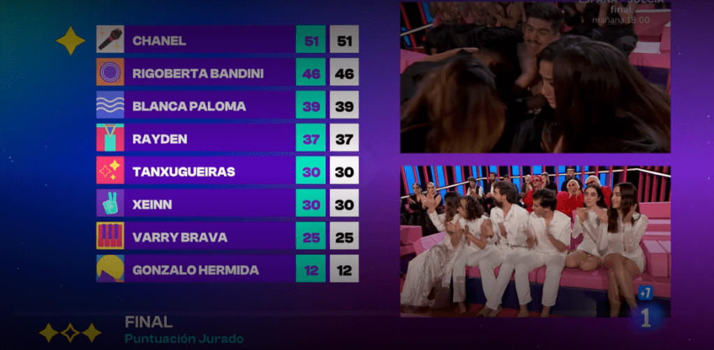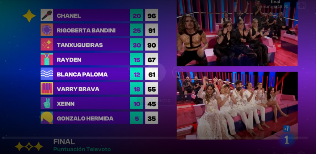 The demoscopic jury awarded 30 points to Tanxuguieras and 25 to Chanel – Chanel is still in the lead, but Rigoberta and Tanxugueiras are catching up!