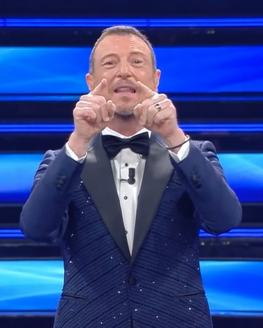 22.33 – On with the songs. Song 17 is Farfalle by Sangiovani. He presents Amadeus with an AC Milan scarf.
