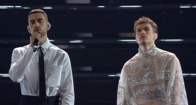 22.11 – The boys have BMXs covered in tinsel. Nice. Mahmood is in a white shirt, black tie and long black skirt. Blanco is in white lace. Mahmood’s almost falsetto deliver draws you straight in, and Blanco’s harmonics really go well. Blanco takes his verse sat atop a grand piano. The silver white staging really sets this off. And it has exceptional orchestration. How would it work with a backing track? Hmmm. It’s definitely in with a chance tonight.