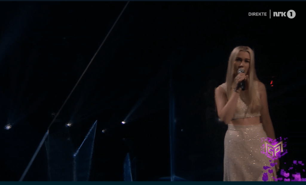 We get the introductory video of Sofie,she’s just talking about her association with Mørland (ESC 2015) and her experience of being on The Voice , Norway. Sofie is alone on stage , very simply dressed in a cream top and skirt, though it does look like her top shrank in the wash ! She certainly has the most powerful vocals of the night, very reminiscent of Ulrikke Brandstorp in 2020 but it feels a bit more “shouty” than Ulrikke . She is alone on stage, this song does not need backing singers .An audience would lift the performance more in the final notes.