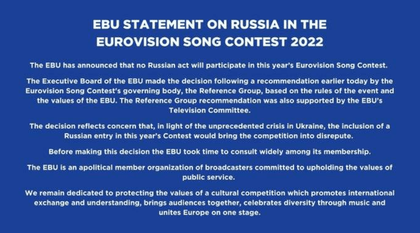 In view of the ongoing situation in Ukraine, the European Broadcasting Union (EBU) has issued a statement on Russia’s participating in the 2022 Eurovision Song Contest in Turin in May. In short, Russia won’t be there.