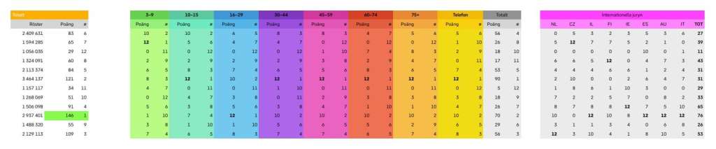 All age group app users (with the exception of 3-9yrs old & 16-29 yrs old), as well as telephone voters, gave their 12 points to Anders Bagge and “Bigger Than The Universe”. Four International Juries and the 16-29yr old app users gave their 12 points to Cornelia Jacobs and “Hold Me Closer”.
