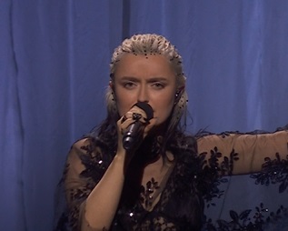 19.12 – Sandra has dry ice surrounding her. She’s in a long white outfit à la Daniela from 1998 – and gives us an ethereal song. In true tradition, she ditches the hooded outfit revealing something more Xena Warrior Princess. It’s a serious effort and powerful as a midtempo number. Her backing, revealed towards the end, are on stilts and masks. It’s all very very mysterious. And very pleasing.