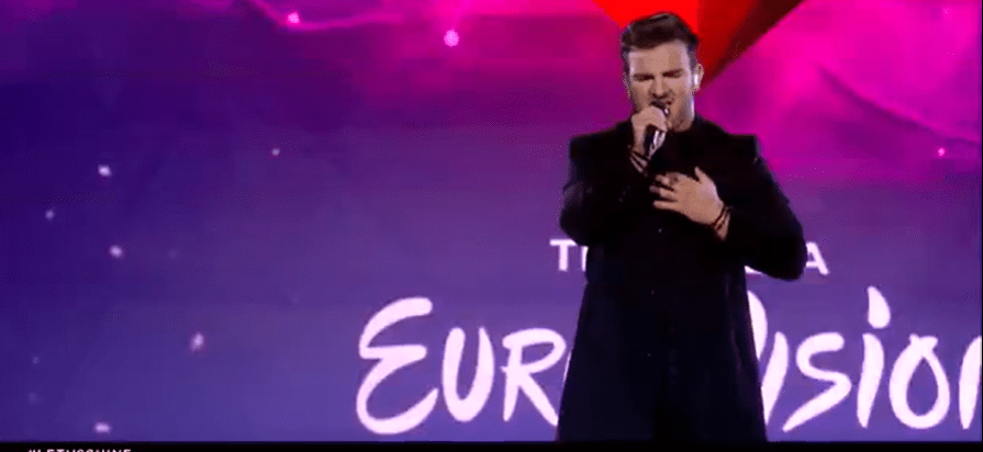 Just to add that you won’t see the actual National final staging tonight and there’s no audience either. Andre is casually dressed in trouser’s waistcoat and shirt with three quarter length sleeves. There’s a bit of the 80’s feel about this song , with some synth background music and Andre just standing alone on stage . It starts off a bit slow then starts to get going halfway through . I do think he needs to engage more with the camera . Fair performance but will need backing dancers /singers in the proper live performance to boost it a bit .