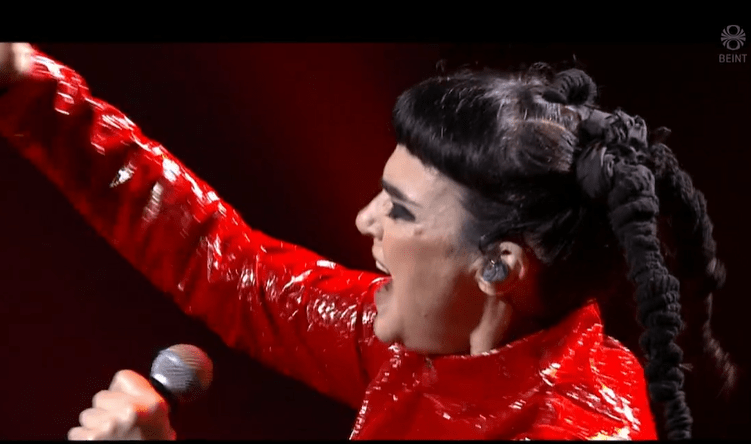 Here we go…onto the show and the show gets underway with a song . That’s a very bright red outfit , with a hairstyle looking a bit like one you’d see at Junior Eurovision !