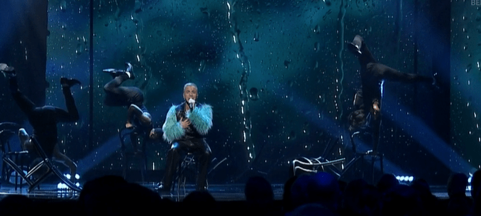 Ulfar is first up this evening . He starts on the stage sat in a chair and looks like he’s borrowed Greece’s staging from last year ,with the chairs turned upside down . Joined on stage by contemporary dancers . He then stand on a chair for the final chorus . For me it’s an ok performance but it just seems to lack something to give it that winner vibe . Not bad for a starting song .