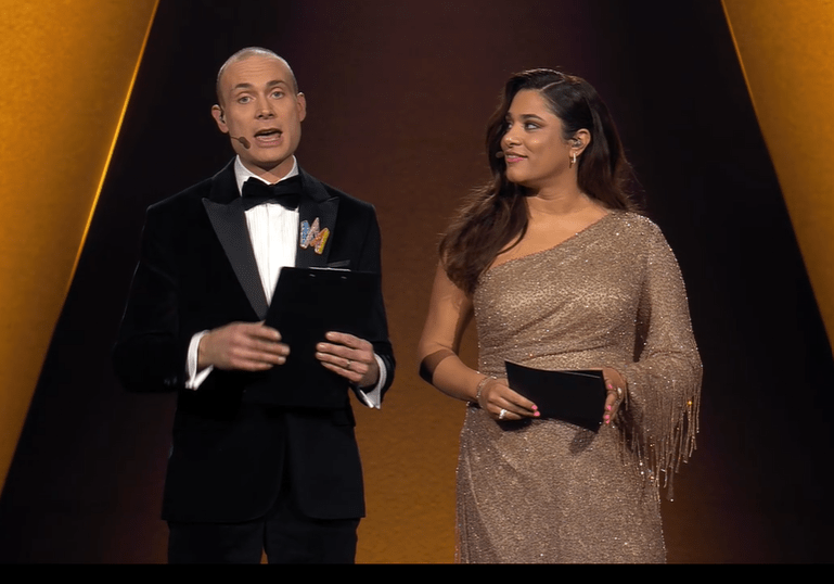 The artists are all dancing to Stefania on the stage now and we meet out hosts , Farah and Jesper .