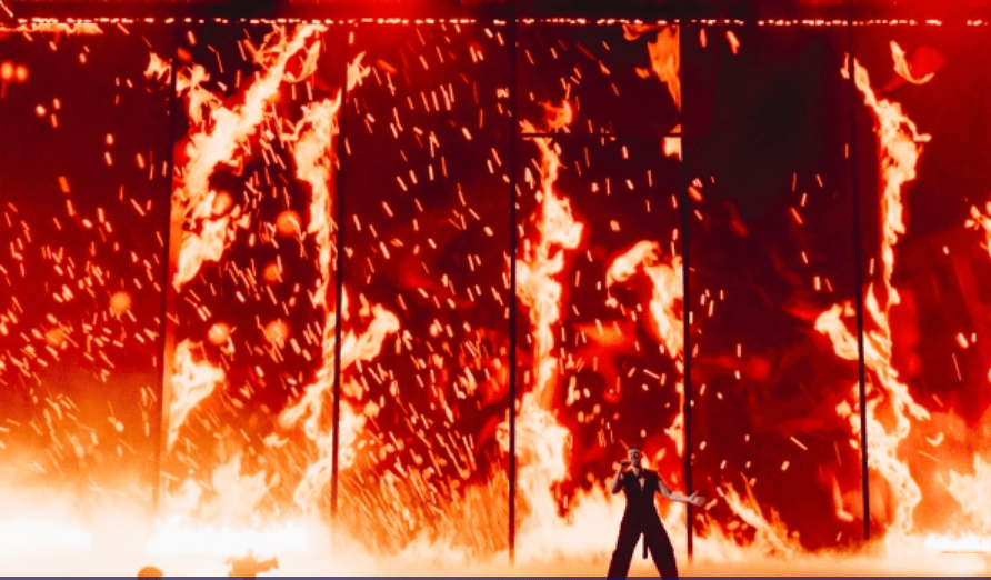 Theodor is in all yellow, jacket and shorts and yellow Pikachu socks ! Starts off on stage sat down with his guitar with swirling blue LED backdrop, which then becomes a backdrop of volcano larvae. with two oversize figures in white frocks either side. He has a female backing dancer cavorting around him .While it looks like an improvement from the national final performance, I will wait to see the whole performance before making any judgment about Theodor’s qualification chances .