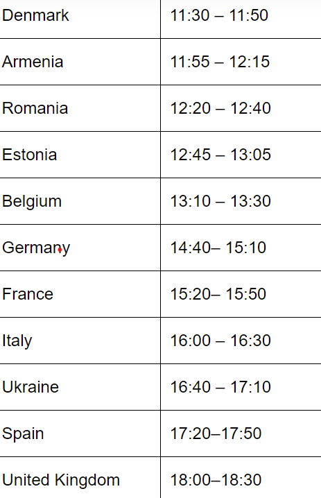 Today , on Day Five , we will see the first 5 of the acts from Semi Final 2 do their second rehearsals , while the Big five countries plus last year’s winners, Ukraine, take to the stage for the very first time . Following their performances today , the Semi Final 2 acts who have rehearsed will have a Tik Tok Meet and Greet with Timur ( you may remember him as a presenter in Kyiv 2017) .Today’s schedule is as follows, in CET.