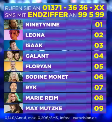 Germany decides tonight who will win the Golden Ticket from broadcasting organisation ARD to the 2024 Eurovision Song Contest in Malmö in May. Nine songs feature in the televised final coming from Berlin. A combination of a 50/50 public vote and international jury will select the winner.