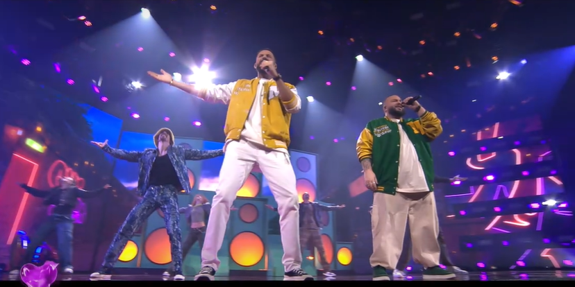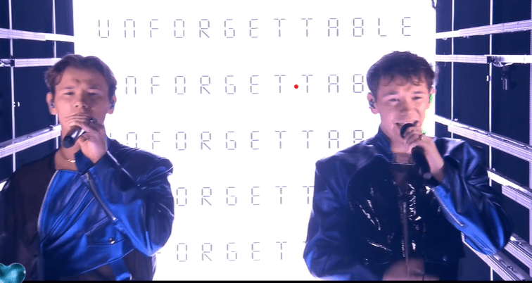 Starts off with LED backdrop of soundwaves , with staging looking a bit of a faster moving version of Benjamin Ingrosso’s staging in 2018 . With the words Unforgettable in the background . They are then joined by four backing dancers in leather coats , with black being the colour of choice tonight. It’s very typical electro pop, however it does sound very similar to their song from last year. A good opener nevertheless. and there’s no Loreen this year !