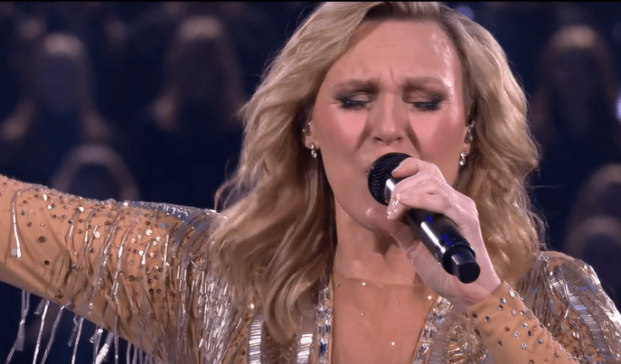 Chelsea is in a red jumpsuit , flanked by several backing dancers dressed casually . It’s all very happy and partly like, with a tropical sunset LED background . Good connection with the camera from Chelsea, she’s clearly enjoying it out on that stage. It’s very lively and well received by the audience .