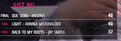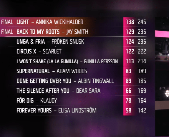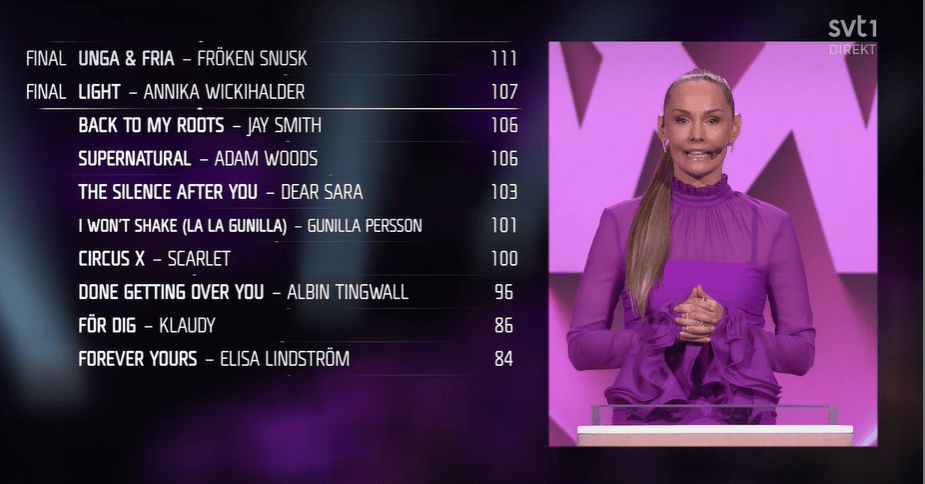 So now we will have a quick televote ( 10 mins ) while we watch recaps of the songs and have a lot of talking and banter in the Green Room. The voting starts from the first song from Heat one .When we come to the results, they will be given in the way that they are at Eurovision, with the lowest on the score board getting their public vote result first and then going up until we get to the leader , which is currently Unga and Fria .It’s all very complicated , but then the Swedes like to keep us interested !