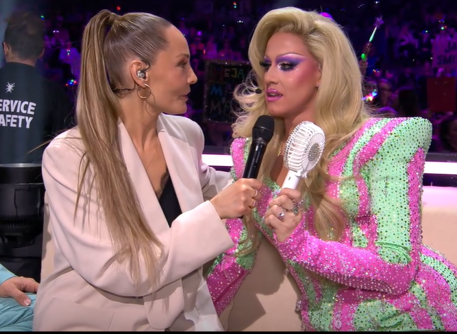 Elektra is here to entertain !Dressed in all pink flanked by a background of large white feathers, joined by four male backing dancers in black and white suits . There’s stripping off of pink outfit to reveal a green and pink short dress. It’s flamboyant and very in your face that’s for certain ! The audience seemed to like it .