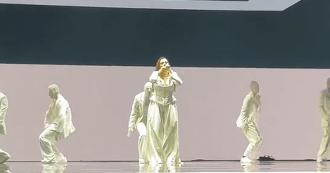 Iolanda seems to have brought the staging from the National Final with her . She heads the stage while her backing singers, all in white with heads covered by what looks like net stocking ends , move around the stage and interact with Iolanda . You can see the Tik Tok clip HERE