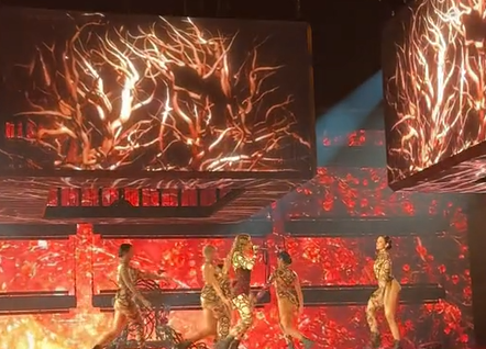 Angelina is dressed in a sparkly , red corset with material depicting plants on her arms and legs . She’s joined by 5 female backing dancers wearing body suits in a similar style to Angelina’s outfit . The LED cubes are lowered down towards the stage , there’s visuals on them of branches and they enclose the dancers .Trees . flowers and plants form part of the LED screens . There’s a giant throne made of twigs and a branches .Lovers of nature will love this !