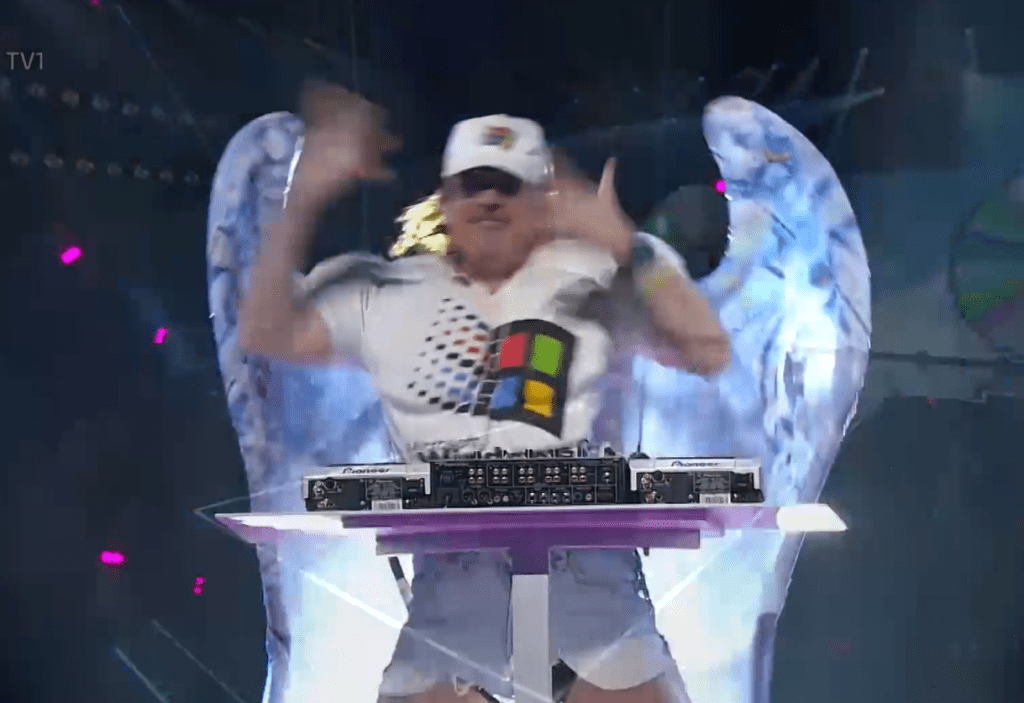 And we’re off ! starting off with a performance from last year’s winners. Windows 95Man . This time the lead singer seems to have borrwed Tixx’s ( Norway 2021) Fallen Angel wings!