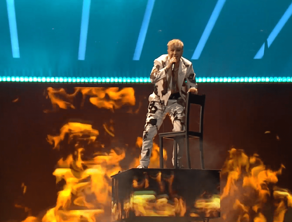 Is it me or does Costee remind me a bit of Marc Almond from Soft Cell ( 1980s group)with his eye make -up?The song title means “Messed up ” and Costee appears on stage on top of several platforms with a chair on top. His clothing is a white out fit with several logos on it . He comes off the platforms and the stage then erupts into pyros and fire LED effects in the backdrop and through the platforms . This could work on a big stage at Eurovision .Not a bad first act .