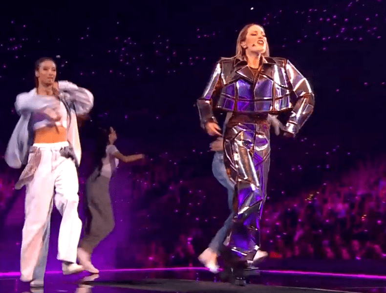 Now we’re told that Goldie locks can’t perform tonight as she has lost her voice ( not the most helpful of things to happen!), so , they will showing a recording of a performance from yesterday ‘s rehearsals . She starts off sat inside a circle , which she moves around in and out of throughout the performance, surrounded by three female backing dancers, the ending produces three circles with three images of Goldielocks ! It’s quite clever staging , could be a contender tonight, even if she hasn’t sung live tonight .
