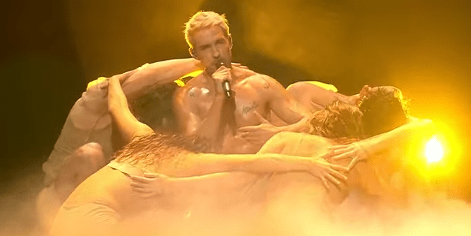 20: 22 Right from the start, it’s clear this is a performance that’s all about making a statement. Markus is shirtless, sporting some rather eye-catching, sand-coloured, shiny bottoms. He’s definitely not holding back! Surrounding him are five dancers, and their choreography is quite something. They interact with Markus in a way that’s almost reverential, touching and supporting him throughout the performance. It creates a very specific visual dynamic, focusing all attention on Markus. Musically, the song has a very contemporary feel. It’s got a strong, electronic beat and a polished production that brings to mind artists like Maruv. It’s a sound that’s very much of the moment.