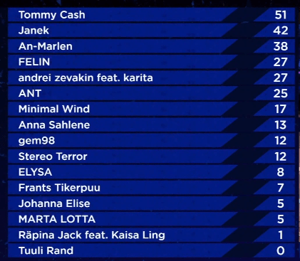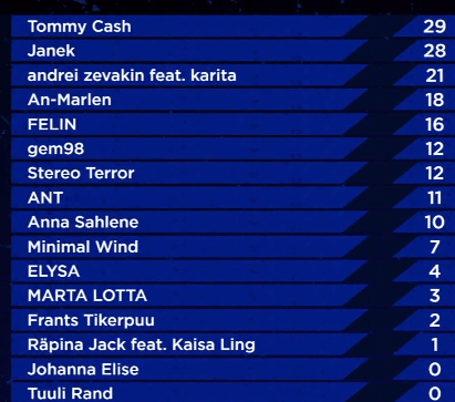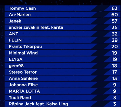19:01 Who was your favourite? For me, the top 3 should be Andrei Zevakin feat. Karita,Frants Tikerpuu and Tommy Cash. For now, we have a 30 minute break but we will be right back.